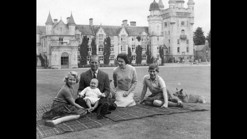 在Balmoral城堡的女王一家,照片中的小婴儿是二儿子安德鲁王子。 -