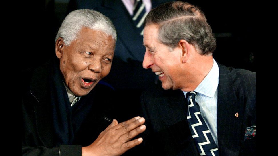 查尔斯王子与南非前总统曼德拉在一起,查尔斯称他是“勇气的化身”。 -