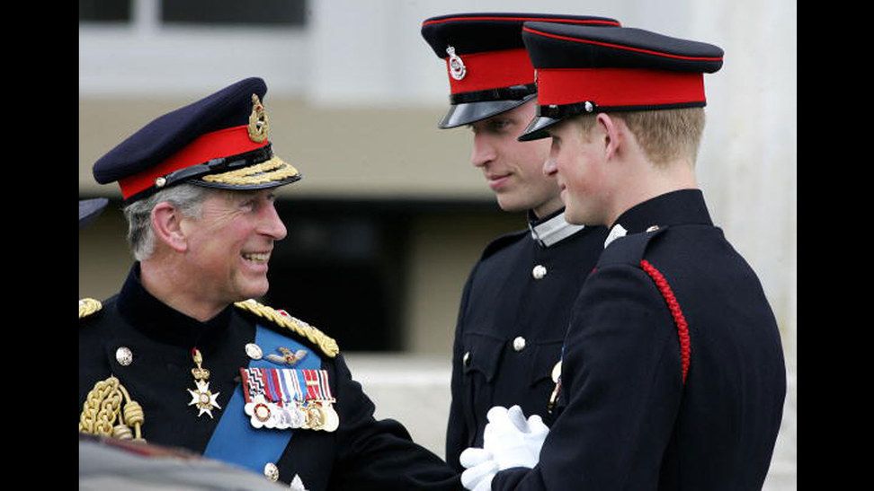 2006年,在桑赫斯特皇家陆军学院(Sandhurst),查尔斯王子看望他的两个儿子威廉王子和哈里王子。随后,哈里王子就被派驻到英军驻阿富汗的前线了。 -