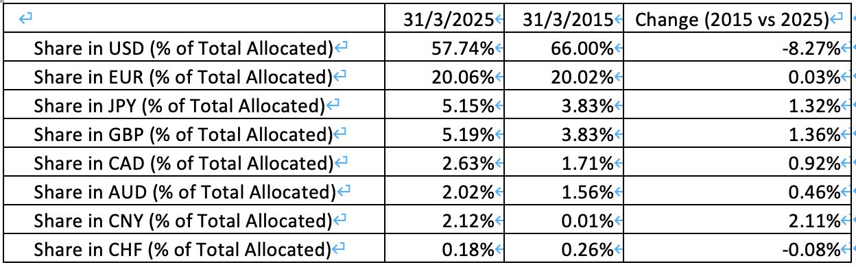 罗格夫教授同时指出,事实上美元的国际储备货币地位,可能在2015年就达到了顶峰,并从此开始走下坡路。举例来说,据国际货币基金组织(IMF)公布的数据显示,2015年美元占全球官方外汇储备比重约66%左右,欧元约占20%,人民币微乎其微。而到了2025年,美元占全球官方外汇储备比重下跌到57%左右,其他主要货币在储备中的比重基本都有所上升,或者保持不变。