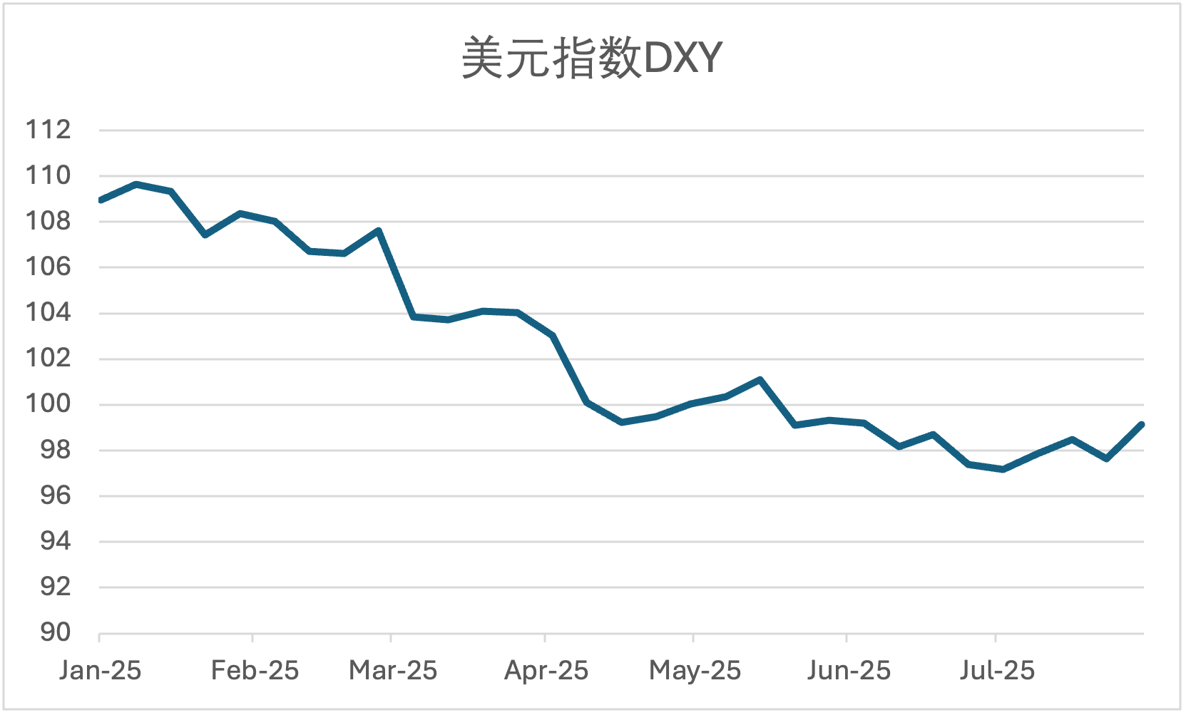 国际货币市场似乎认同罗格夫的判断,从2025年1月初算起到7月底,美元指数(DXY)在短短的半年多时间内下跌了9%左右。这说明货币市场对美元持谨慎态度:一方面是对美联储利率政策能否保持独立性产生怀疑,另一方面也是对特朗普政府造成的政策不确定性产生担忧。